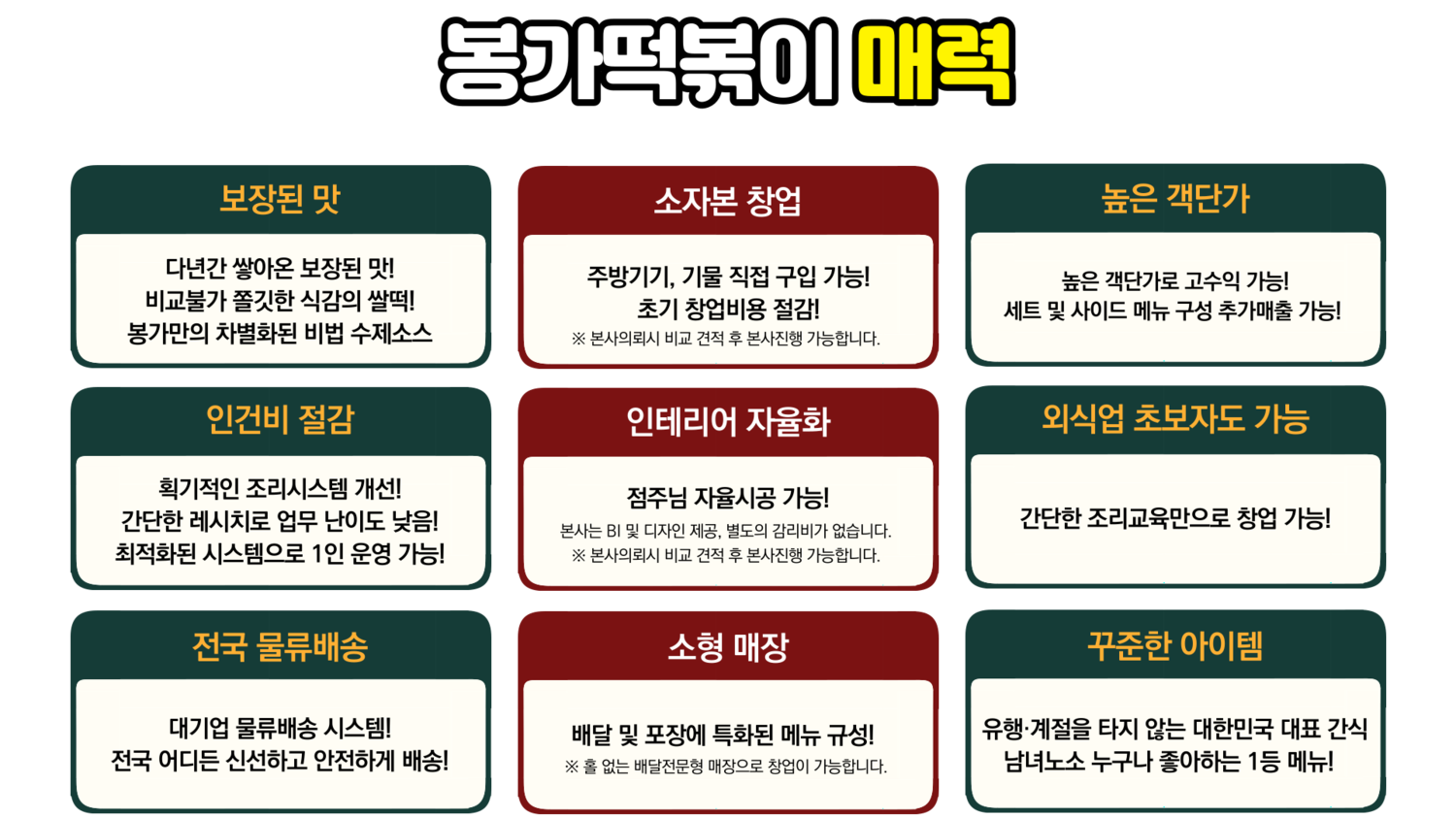 자신있는 지역에 그 누구보다 먼저 "해운대봉가떡볶이"를 선점하시어 창업 혜택과 함께 성공 창업을 꿈을 이룰 수 있습니다!